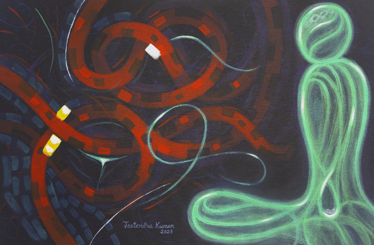 Jeetendra Kumar has dabbled with Abstraction that are thematic in intent, using swirls and patterns, representing a “symphony of emotions”. In few works, he creates ‘unbridled movement’ to portray feelings that reflect on the question of time against the rigidity of routine as inspired by Charlie Chaplin’s classic film, ‘Modern Times’. These series with sweeping lines are creative manifestations of chaos in our times, to include animal and human forms in his compositions. He attempts to portray “hope and opportunities in the complex and uncertain modern times”. Partial to the “strong, energetic” and representing beauty and elegance, the horse, is “ a powerful symbol of dynamic movement, the assertion of force” and a fundamental subject related to his work. His preferred colour palette are meant to radiate positivity with blues, reds and oranges that merge into “Oneness”.