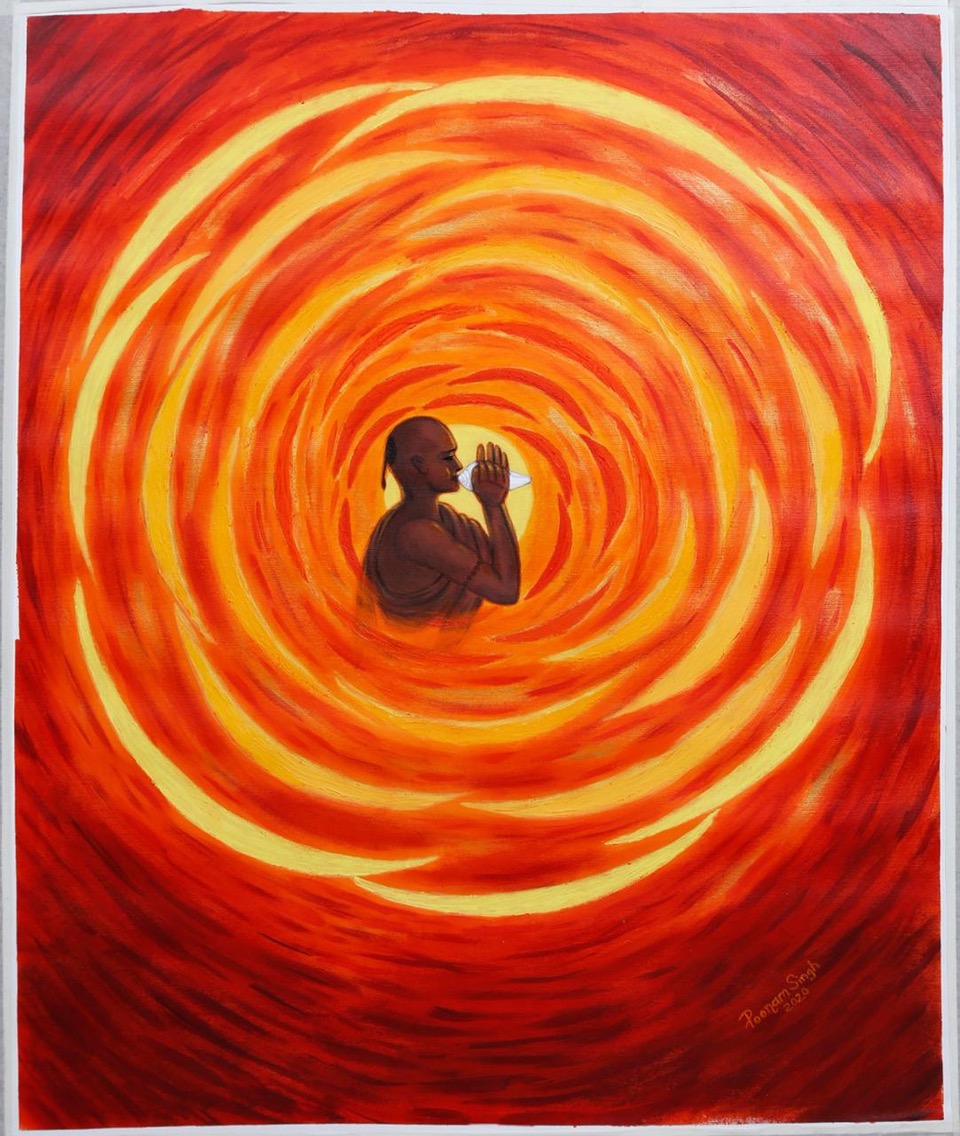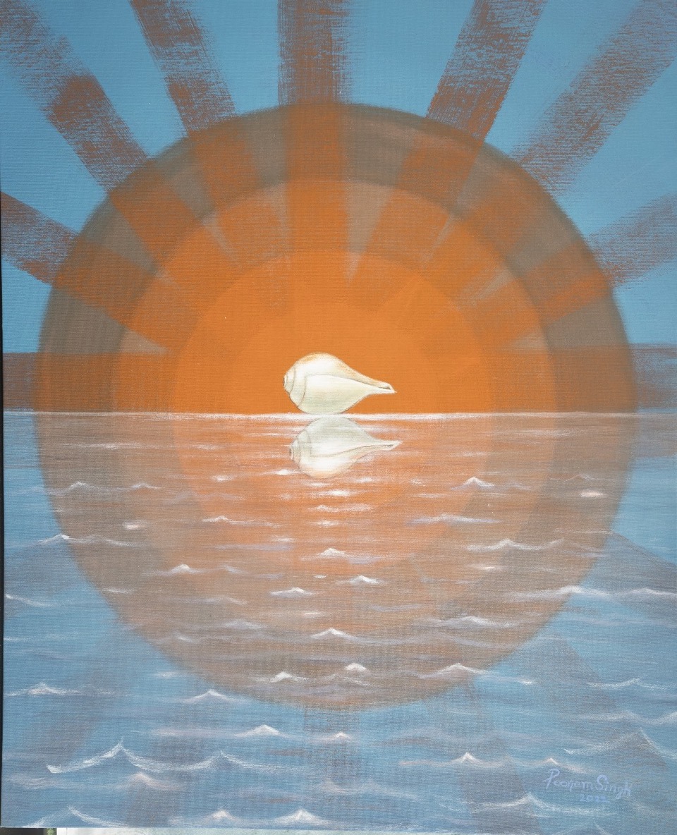 Poonam Singh’s paintings have spiritual leanings inspired by Indian philosophy in her ‘Conch Series’ that tend to evoke peace and harmony using symbolism that encompasses humanity as a whole. She explores her inner emotions and spirituality using the conch (shell) as symbolic of purity for the environment and that of a divine energy that resonates with the circle of life.