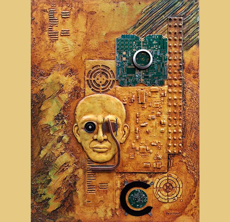 Umesh Prasad – A sculptor primarily, who creates metaphors to weave stories and is inspired to express his thoughts by delving into a source of e-waste. The artist believes in experimenting from a very young age and has created a body of works that displays his propensity.